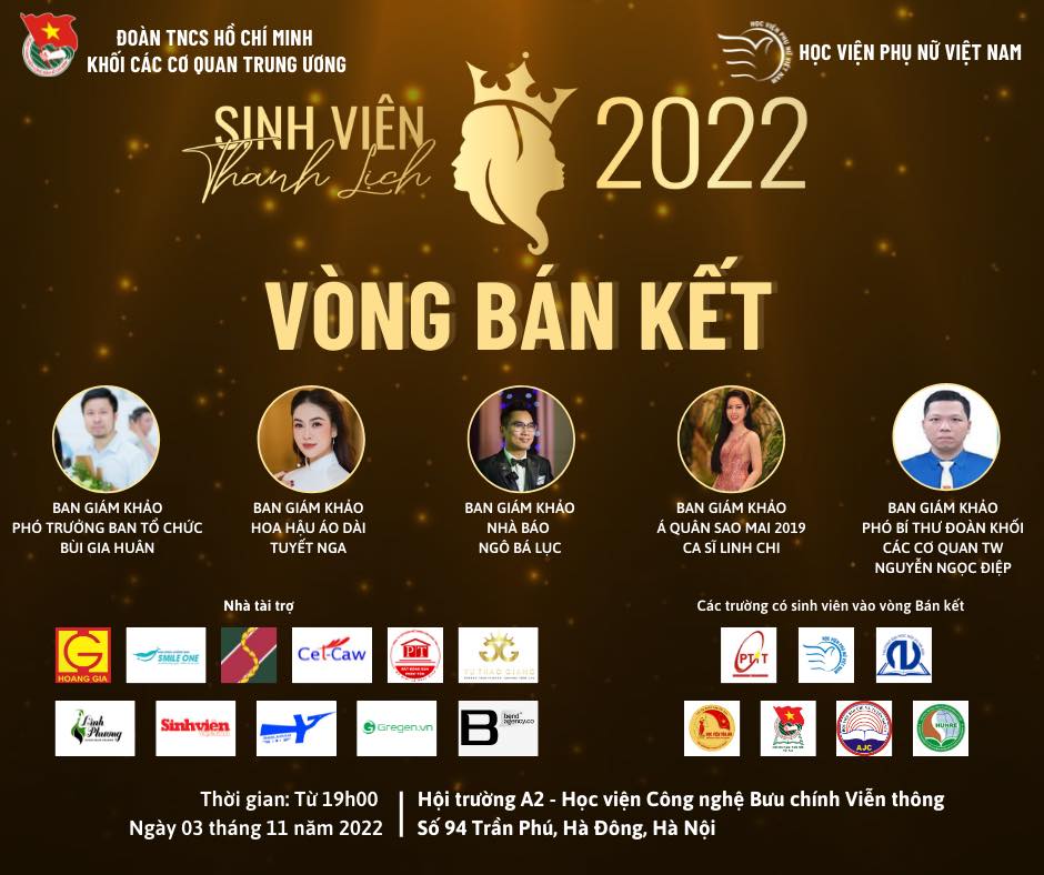 Mời bạn đọc tới tham dự, cổ vũ cho các thí sinh tham gia Vòng bán kết cuộc thi Sinh viên thanh lịch 2022 tại: Hội trường A2, Học viện Công nghệ Bưu chính Viễn thông (94 Trần Phú, Hà Đông, Hà Nội) vào lúc ngày . . .