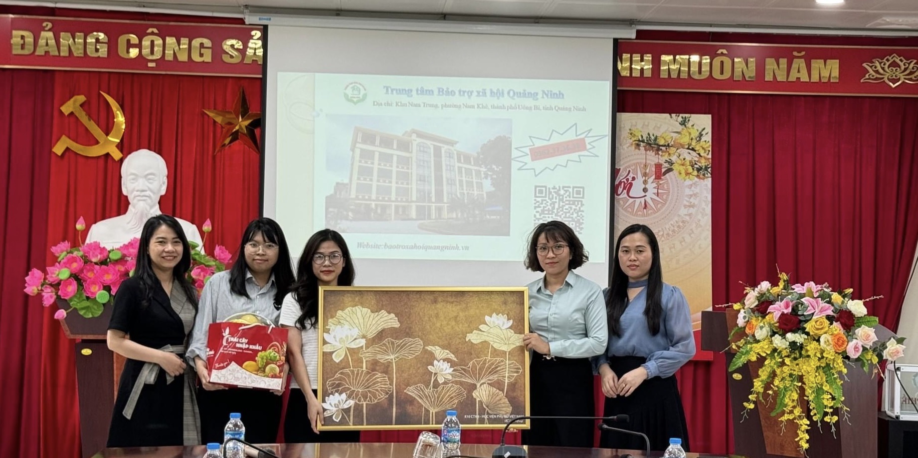 (Đại diện Trung tâm Bảo trợ xã hội tỉnh Quảng Ninh cùng với Giảng viên hướng dẫn đoàn và sinh viên chụp ảnh lưu niệm)